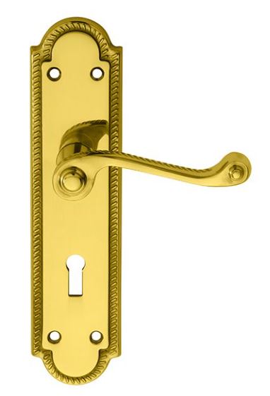 Lever on lock backplate. Standard profile 57mm c/c. Shaped backplate with stepped rounded curves top and bottom. A classic scroll lever set with the traditional Georgian rope design adorning the perimeter of the backplate and along the top of the lever. A graceful and elegant combination reminiscent of a bygone era. Comes with a 10 year mechanical guarantee and is Fire door rated. Suitable for domestic use.