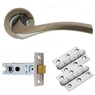Pack includes a pair of handles, a bolt through 64mm tubular latch and a pair of hinges. Sines lever on concealed fix screw on rose. The lever has an angular twist to achieve the best possible ergonomic grip. The thumb and hand fall naturally into its accommodating shape.