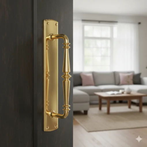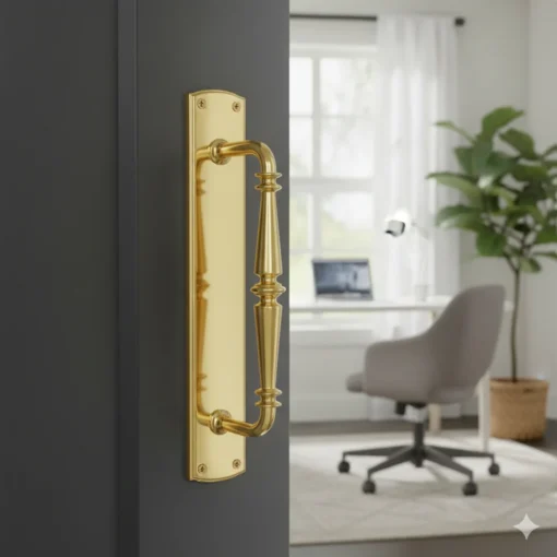 A smart ornate pull handle mounted onto a large backplate. This decorative pull handle is cranked slightly and can be used left or right handed. The handing is simply reversed by turning the product upside down. A sturdy pull handle on a stepped rectangular backplate which has a gentle curve at the top and bottom. Suitable for domestic and commercial use.