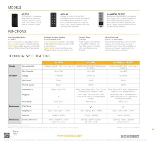 The A3 Vandal Resist MIFARE® compatible door controller provides a compact, affordable proximity access control system allowing flexible entry for up to 600 users, including two Panic Clients.