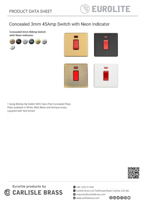 Eurolite Concealed 3mm 1 Gang 45Amp Dp Switch With Neon – Polished Chrome The Eurolite Concealed 1 Gang 45Amp DP Switch with Neon Indicator in Polished Chrome is a discreet yet powerful electrical control solution. With an ultra-slim 3mm profile, it seamlessly integrates into walls for a sleek and modern look. The 45Amp Double Pole (DP) design ensures robust power control for heavy-duty applications, while the built-in neon indicator provides clear visual feedback. Crafted with precision and finished in polished chrome, it exudes timeless elegance and durability. Whether in residential or commercial settings, the Eurolite Concealed 1 Gang 45Amp DP Switch with Neon Indicator in Polished Chrome combines aesthetics with functionality, offering a reliable and stylish choice.