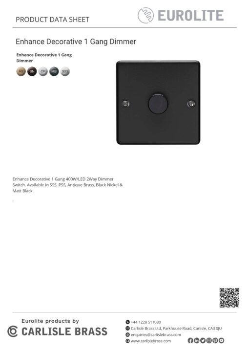 Eurolite Enhance Decorative 1 Gang Dimmer – Black Nickel The Eurolite Enhance Decorative 1 Gang Dimmer in Black Nickel is a perfect fusion of style and functionality for your lighting control needs. With its elegant black nickel finish, it adds a touch of sophistication to any interior. This dimmer switch allows you to effortlessly adjust the lighting intensity to create the perfect ambiance for any occasion. Its sleek and modern design complements contemporary decor while the high-quality construction ensures long-lasting durability. Whether in homes or commercial spaces, the Eurolite Enhance Decorative 1 Gang Dimmer in Black Nickel not only elevates the aesthetics but also provides precise and convenient control over your lighting, enhancing the overall atmosphere.