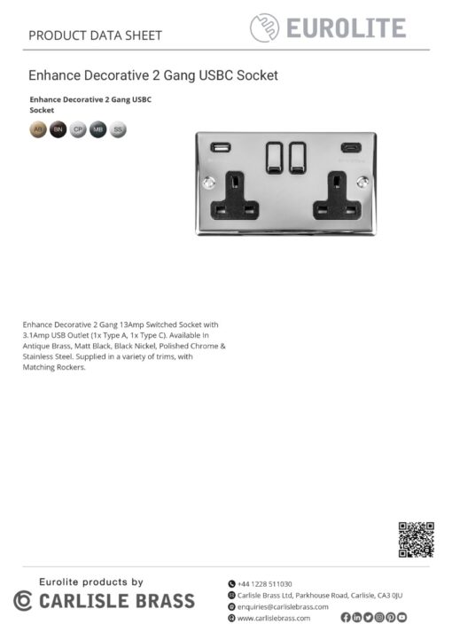 Eurolite Enhance Decorative 2 Gang 13Amp Switched Socket With Usb C Stainless Steel – Satin Stainless