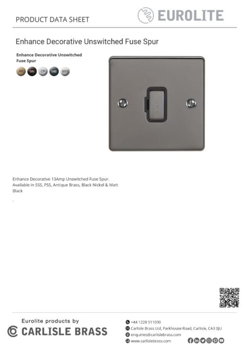 Eurolite Enuswfssb 13Amp Unswitched Fuse Spur Satin Enhance Range Black Trim The Eurolite Enuswfssb 13Amp Unswitched Fuse Spur from the Enhance Range with Black Trim is a versatile and stylish electrical accessory. Its satin finish, combined with the black trim, adds a touch of contemporary sophistication to your interior decor. This unswitched fuse spur provides a direct and continuous power supply to your electrical appliances or devices without the need for an additional switch, enhancing convenience. Crafted for durability and long-lasting performance, it ensures reliable power distribution. Whether for residential or commercial use, the Eurolite Enuswfssb fuse spur seamlessly combines aesthetics and practicality, making it an excellent choice for those who appreciate both style and functionality.