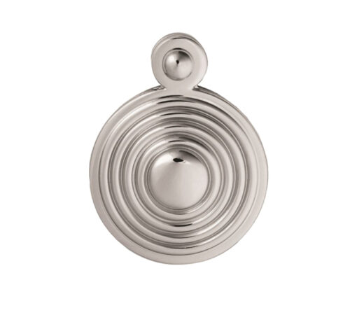 Reeded Queen Anne style covered keyhole escutcheon for use with standard key locks. Covered keyhole escutcheon with a circular ring patterned sliding flap pivoted at the top