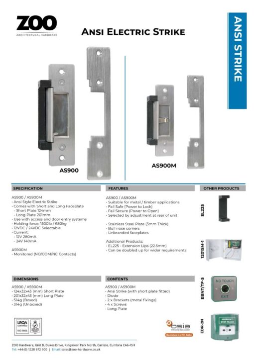Zoo Hardware ANSI Monitored electric strike, 12/24vdc selectable, fail safe/ secure selectable AS900M