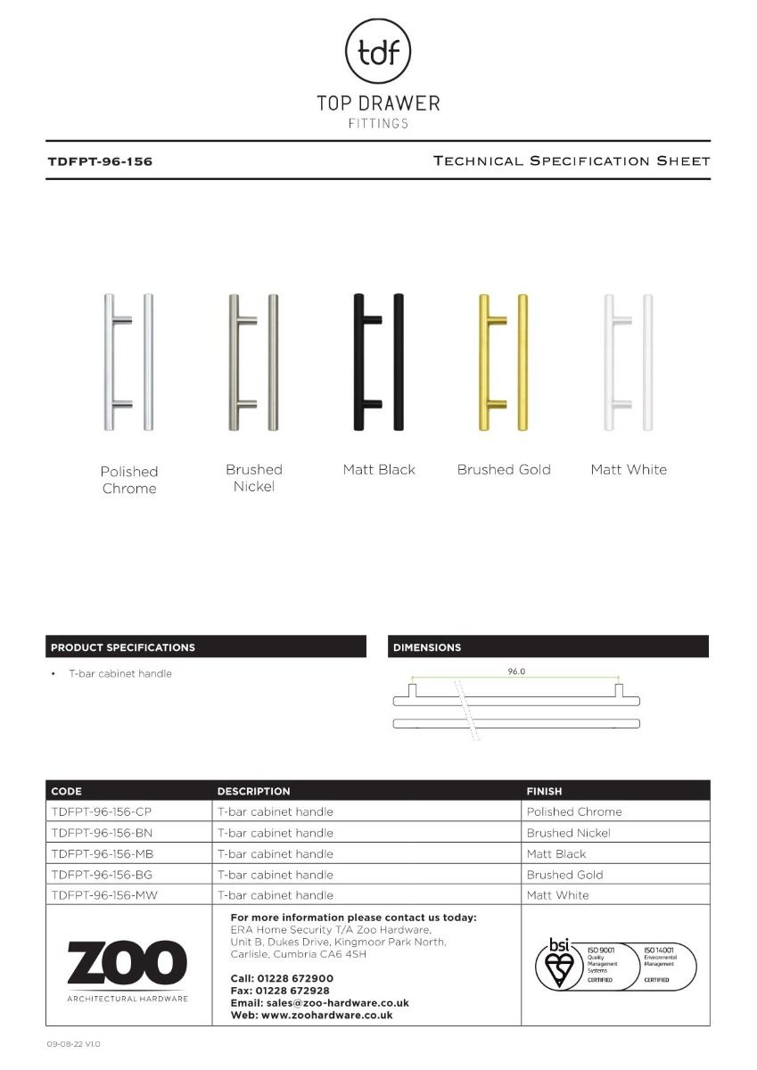 The Zoo Hardware TDFPT-96-156BN T Bar Cabinet handle is a stylish and functional addition to any cabinet or drawer. With a 96mm center-to-center measurement and a total length of 156mm, it provides ample space for easy gripping and pulling. The brushed nickel finish adds a touch of sophistication to your furniture. Made to last, this cabinet handle from Zoo Hardware combines durability, versatility, and aesthetic appeal.