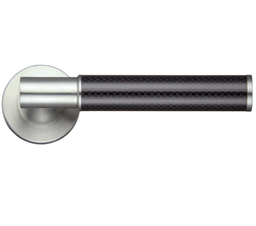 The Eros door handle is a stainless steel sprung handle with carbon fibre lever, the lever is straight and tubular in shape with a raised grip for comfortable use